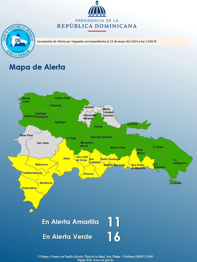 Las provincias en alerta verde son La Romana, El Seibo, Sánchez Ramírez, Monte Plata, Duarte, Santiago Rodríguez, Santiago, La Altagracia, Hato Mayor, Samaná, La Vega, Monseñor Nouel, Monte Cristi y Puerto Plata.