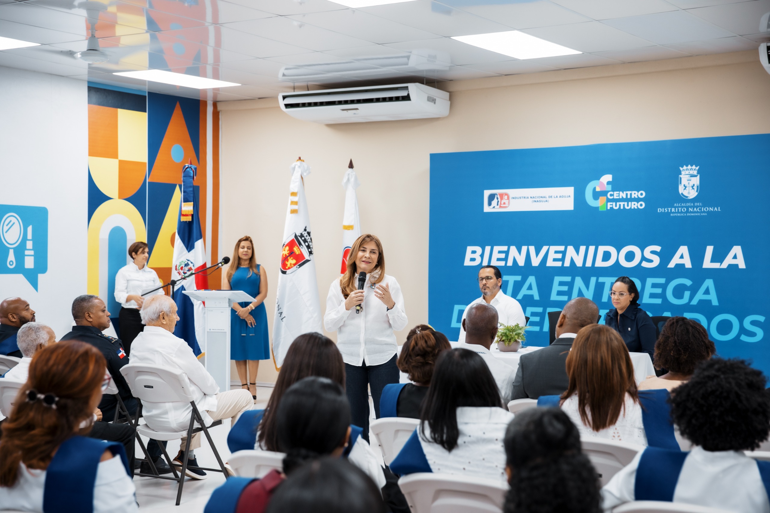 Santo Domingo, DN. – La alcaldesa Carolina Mejía, junto a la Industria Nacional de la Aguja (Inaguja), encabezó la entrega de 108 certificados a estudiantes del Centro Futuro, quienes culminaron exitosamente su formación técnico-profesional gratuita en el área textil.