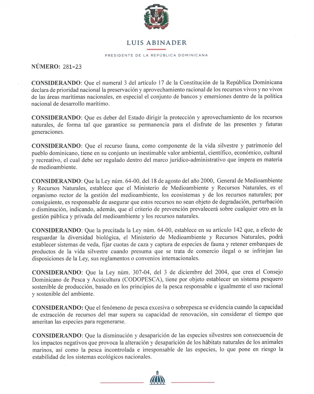 Santo Domingo.- El Poder Ejecutivo emitió el decreto 281-23, donde se establece una veda por dos años, en todo el territorio nacional, para la captura, pesca y comercialización de las familias de peces herbívoros arrecifales.