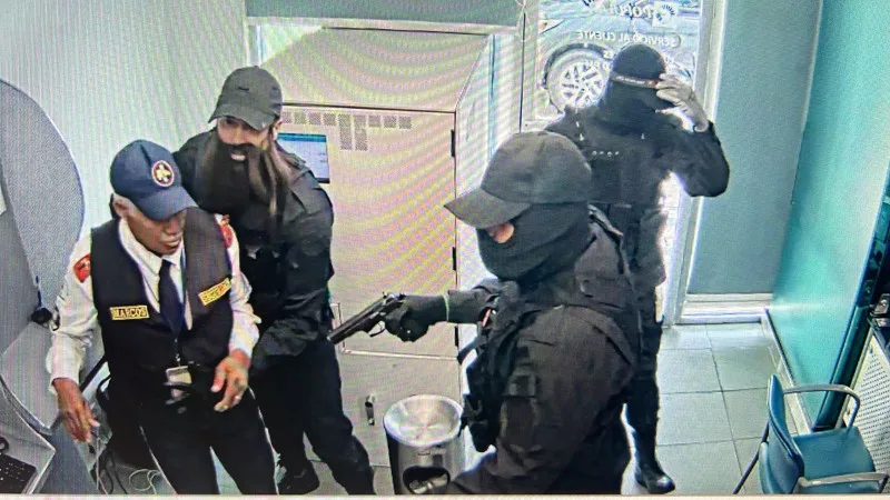 Las cámaras de seguridad del banco captaron el momento en que los delincuentes llegaron y apuntaron con un arma al guardia de seguridad. En las imágenes, que se filtraron en redes sociales, se observa a un hombre vestido de negro, con chaleco antibalas, gorra, guantes, barba falsa y una pistola. Otros dos asaltantes, vestidos de forma similar y con pasamontañas, también ingresaron al banco. Tras el robo, los asaltantes salieron con valijas de dinero y huyeron en una jeepeta negra con cristales tintados.